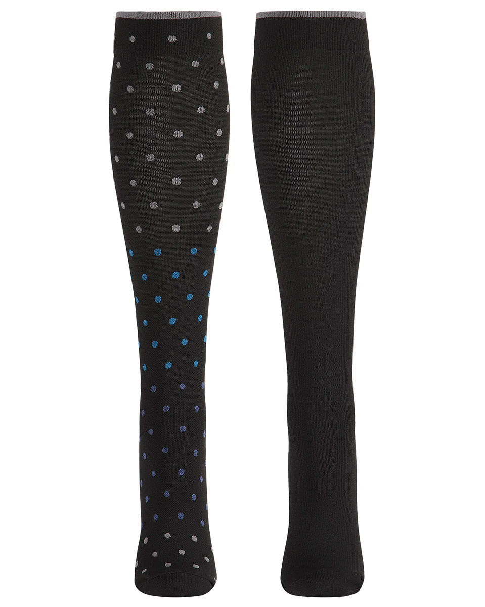 Leg pain got you depressed? Time to compress in our 2 Pair Women's Dotted Graduated Compression Socks. These contrasting compression socks are the perfect solution for tired legs, using graduated compression that helps reinvigorate your legs by improving circulation. Other comfortable features include a smooth, compression free toe and comfort cuff for staying power without restriction. Comes in a 2-pack of one solid and one delicately dotted sock for added value.