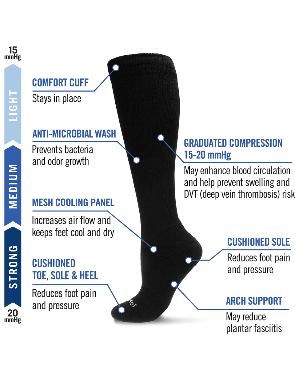 Our Classic Athletic Cushion Sole Knee High Cotton Blend 15-20mmHg Graduated Compression Socks is the ideal sock to sport on the field or in the gym. With a graduated compression from ankle to knee, this basic but beneficial sock may help soothe sore, hardworking legs after a workout or a big game. Its cotton blend fabric is breathable, soft, and easy to wear all day long, making these stellar everyday socks.