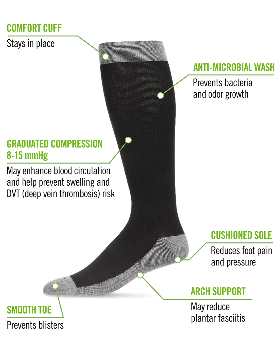 Compress to impress in our Men's Two-Tone Contrast Bamboo Blend 8-15mmHg Graduated Compression Socks. These compression socks are the perfect solution for tired legs, using graduated compression that helps reinvigorate your legs by improving circulation. Other comfortable features include a smooth, compression free toe and comfort cuff for staying power without restriction.