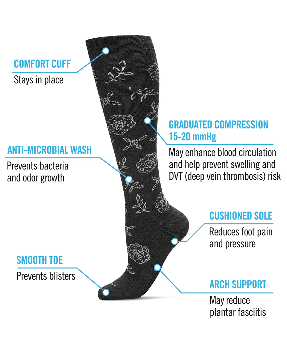 Our Women's Floral Cotton Blend 15-20mmHg Graduated Compression Socks will bring you the relief you need in no time. With a moderate compression of 15-20 mmHg, our graduated compression technology can promote blood circulation and provide relief for your tired legs, with a comfort cuff that stays in place without squeezing too tightly. Dream of spring days with our pretty floral print, perfect for a casual or dressy outfit. Cotton fabric gives these a soft cushioned feel for all day wear.