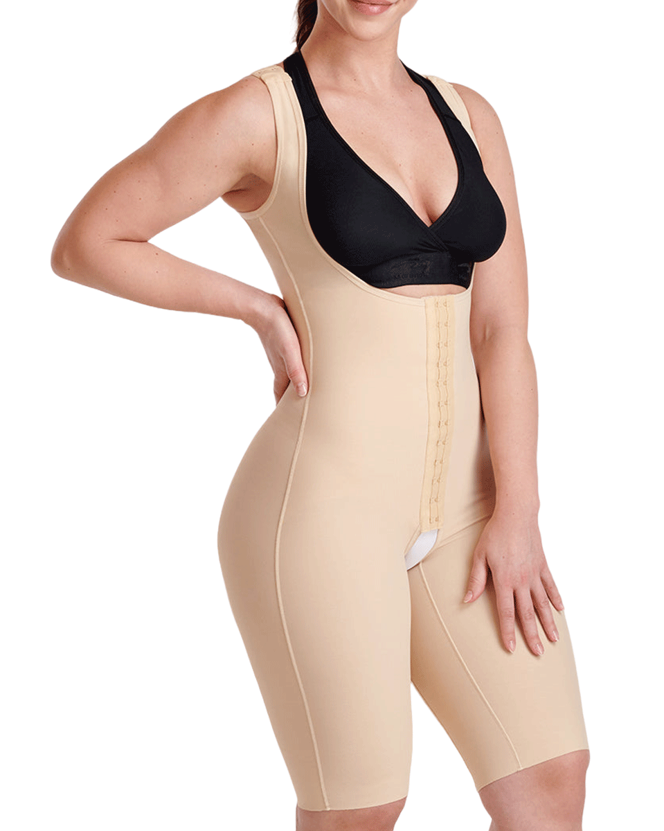 This bodysuit allows for a customizable fit with adjustable front closures and shoulder straps. Molded buttocks provide even compression and lift. Features an open crotch to easily use the bathroom without removing the garment.