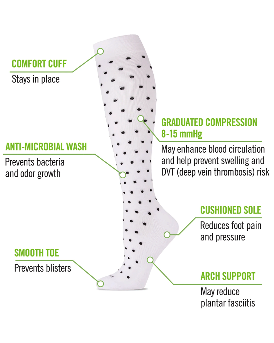Compress and destress in our Classic Polka Dots Bamboo Blend 8-15mmHg Compression Socks. These Classic Polka Dots Compression therapy socks are the perfect wake-up-call for tired legs, using graduated compression that helps reinvigorate your legs by improving circulation and offering a cozy, snug hug that keeps you feeling comfortable day-through-night and through that three-hour flight. MeMoi approved postpartum product.