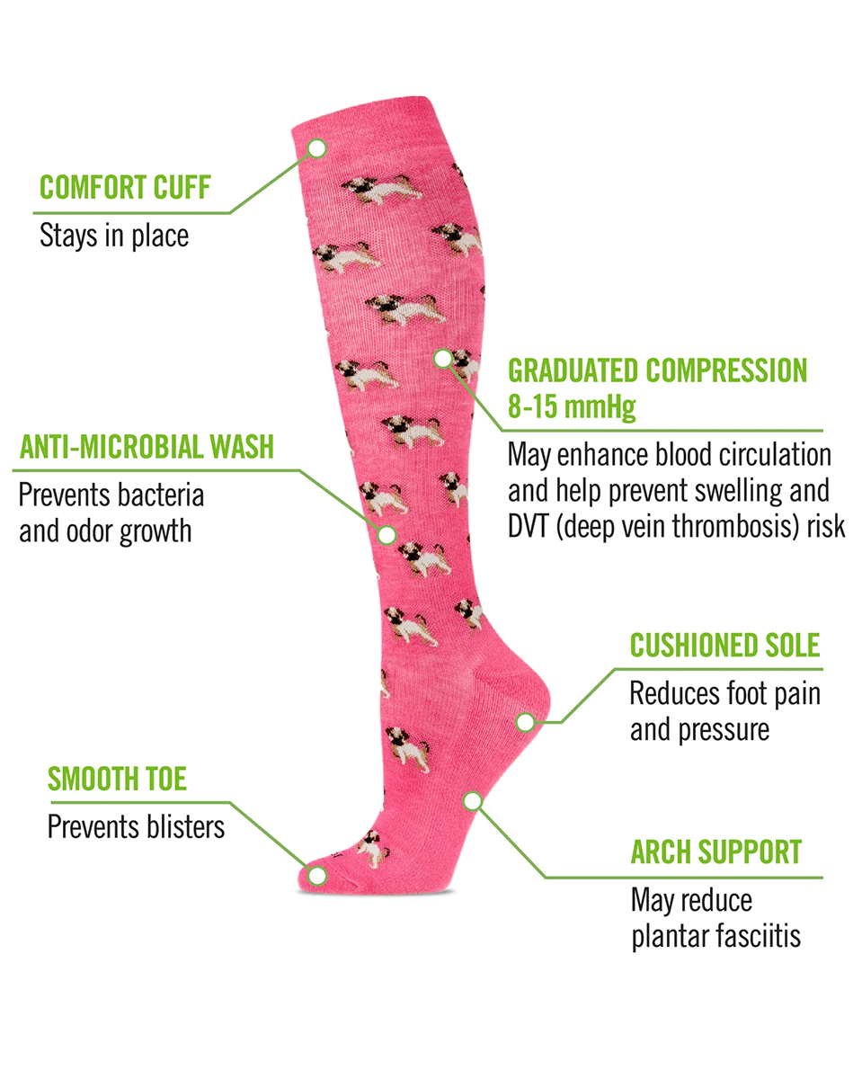 Compress and destress in our Pretty Pups 8-15mmHg Mild Compression Socks. These Pretty Pups Compression therapy socks are the perfect wake-up-call for tired legs, using graduated compression that helps reinvigorate your legs by improving circulation and offering a cozy, snug hug that keeps you feeling comfortable day-through-night and through that three-hour flight. MeMoi approved postpartum product.